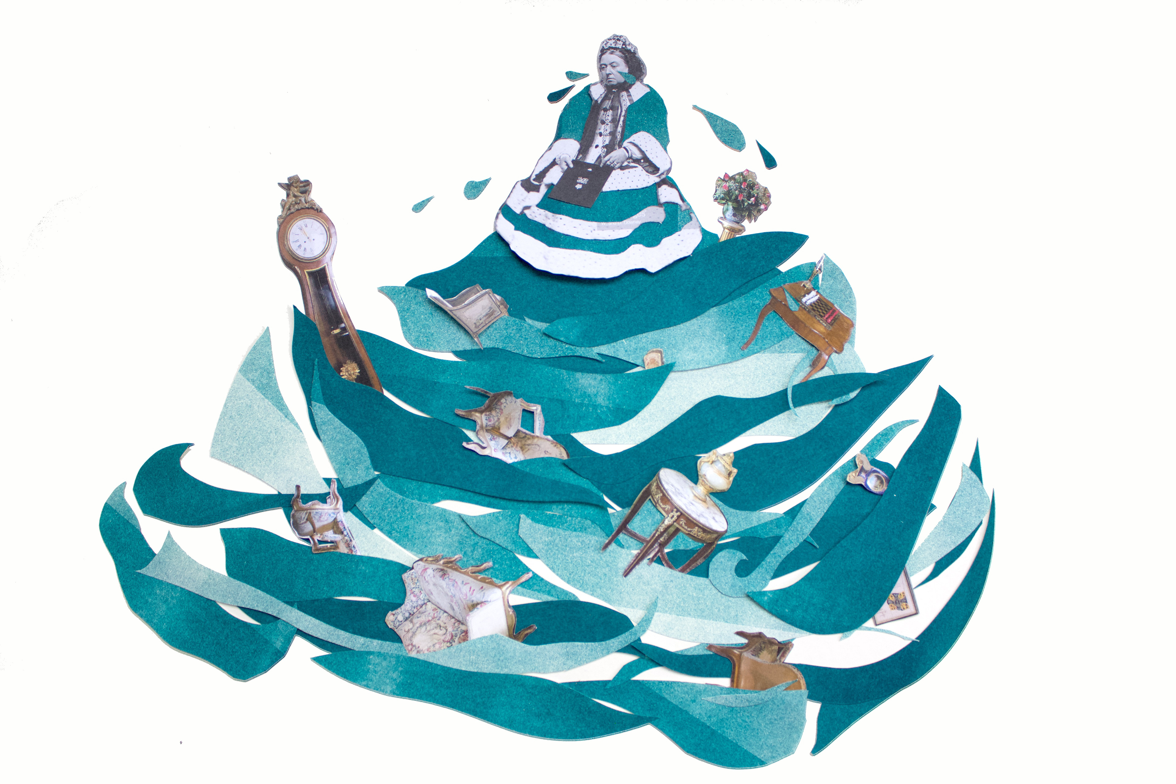 Een collage van Queen Victoria in de rouw om haar overleden echtgenoot Prins Albert. Gemaakt met een combinatie van foto's en structuren gedrukt met de riso printer.